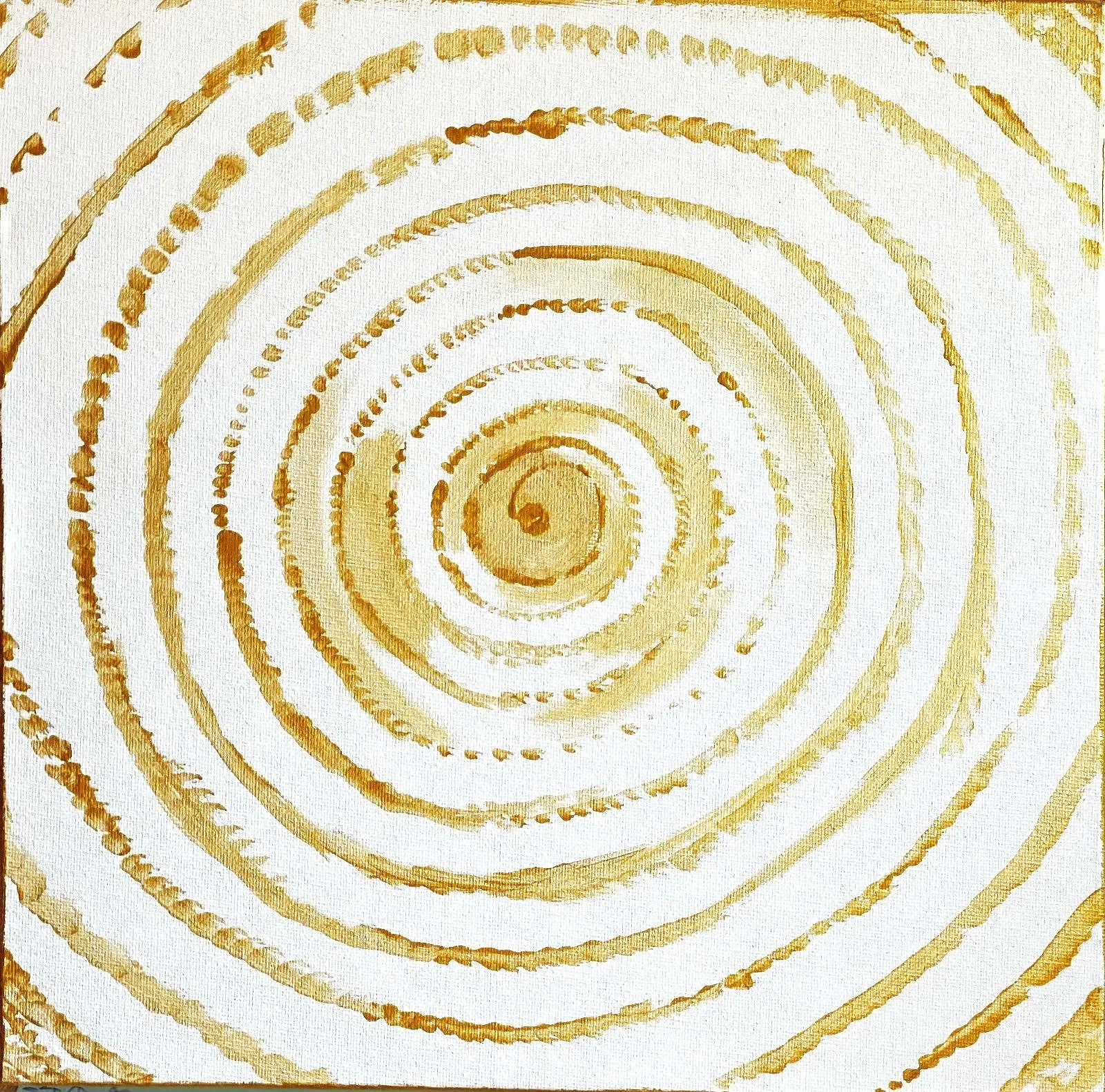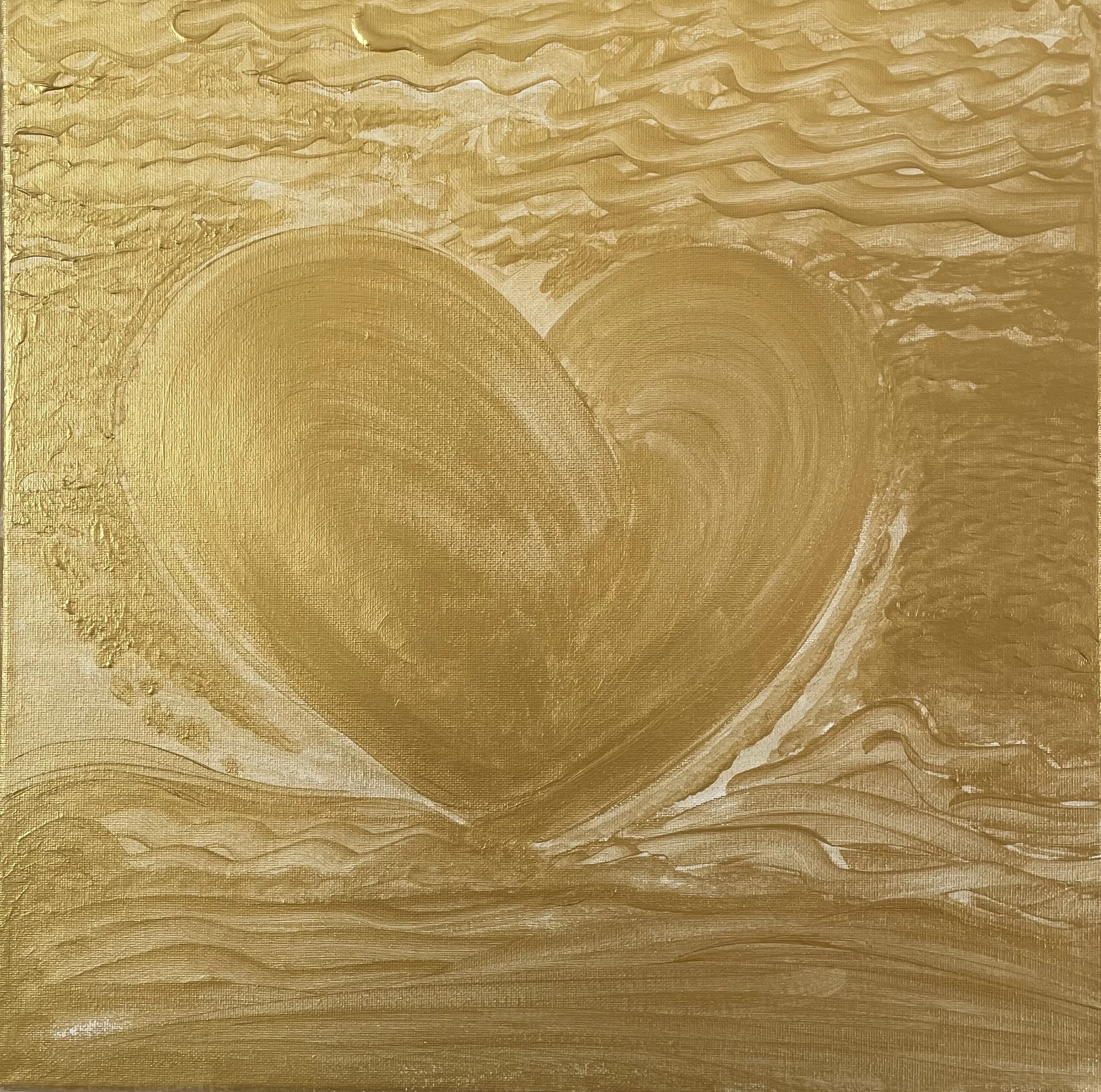 Ein kraftvoll wie pulsierend goldenes Herz. Es ist eingebettet in demselben Goldton, dass die Bewegungen des Lebens auf der Erde, dem dazwischen & dem Kosmos beschreibt. Alles in diesem Gold denn alles ist aus derselben Quelle.